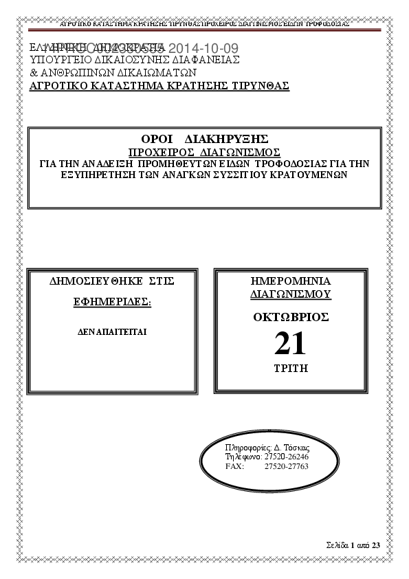 9. ΠΡΟΧΕΙΡΟΣ ΔΙΑΓΩΝΙΣΜΟΣ ΓΙΑ ΤΗΝ ΑΝΑΔΕΙΞΗ ΠΡΟΜΗΘΕΥΤΩΝ ΕΙΔΩΝ ΤΡΟΦΟΔΟΣΙΑΣ ΓΙΑ ΤΟ Α.Κ.Κ.. ΤΙΡΥΝΘΑΣ