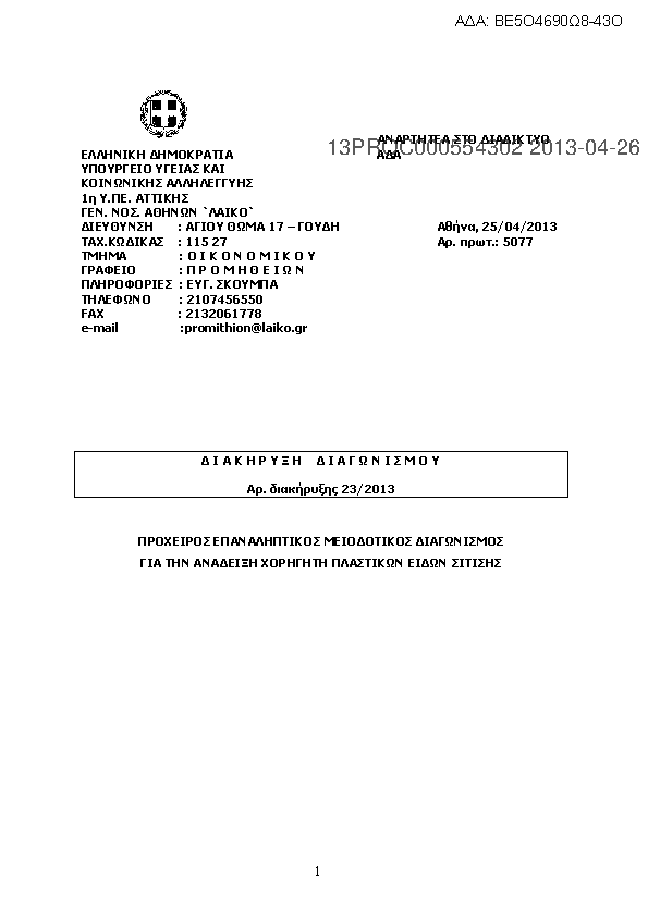 3. 23/2013 ΔΙΑΚΗΡΥΞΗ ΠΡΟΧΕΙΡΟΣ ΕΠΑΝΑΛΗΠΤΙΚΟΣ ΜΕΙΟΔΟΤΙΚΟΣ ΔΙΑΓΩΝΙΣΜΟΣ ΓΙΑ ΤΗΝ ΑΝΑΔΕΙΞΗ ΧΟΡΗΓΗΤΗ ΠΛΑΣΤΙΚΩΝ ΕΙΔΩΝ ΣΙΤΙΣΗΣ