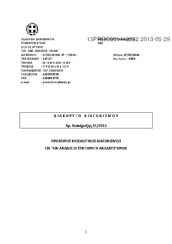9. 25/2013 ΔΙΑΚΗΡΥΞΗ ΠΡΟΧΕΙΡΟΥ ΔΙΑΓΩΝΙΣΜΟΥ ΓΙΑ ΤΗ ΣΥΝΤΗΡΗΣΗ ΑΝΕΛΚΥΣΤΗΡΩΝ