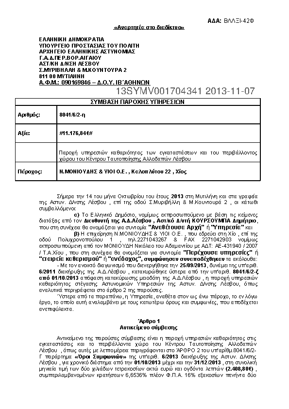 10. ΣΥΜΒΑΣΗ ΠΑΡΟΧΗΣ ΥΠΗΡΕΣΙΩΝ ΚΑΘΑΡΙΟΤΗΤΑΣ ΤΟΥ ΚΕΝΤΡΟΥ ΤΑΥΤΟΠΟΙΗΣΗΣ ΑΛΛΟΔΑΠΩΝ ΛΕΣΒΟΥ