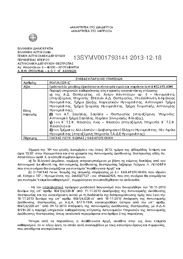 5. Σύμβαση παροχής υπηρεσιών καθαριότητας στις Αστυνομικές Υπηρεσίεςτης Α.Δ. Μαγνησίας, έτους 2014.