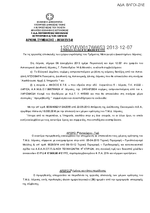 3. ΣΥΜΒΑΣΗ ΓΙΑ ΕΡΓΑΣΙΕΣ ΕΠΙΣΚΕΥΗΣ ΤΩΝ ΧΩΡΩΝ ΚΡΑΤΗΣΗΣ ΤΟΥ ΤΜΗΜΑΤΟΣ ΜΕΤΑΓΩΓΩΝ ΔΙΚΑΣΤΗΡΙΩΝ ΛΑΡΙΣΑΣ