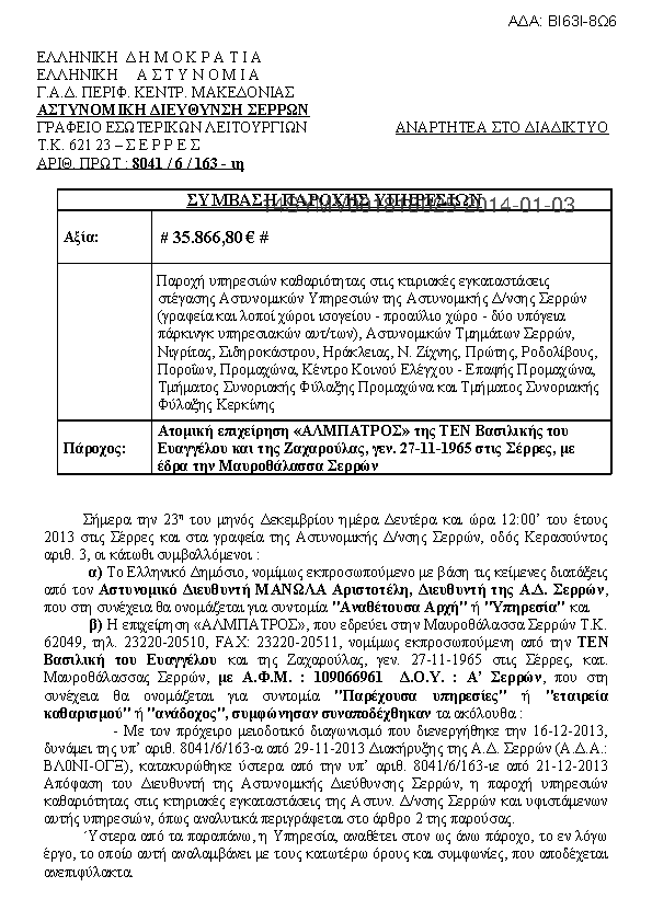 9. Σύμβαση παροχής υπηρεσιών καθαριότητας οικημάτων στέγασης της Α.Δ. Σερρών, για το έτος 2014