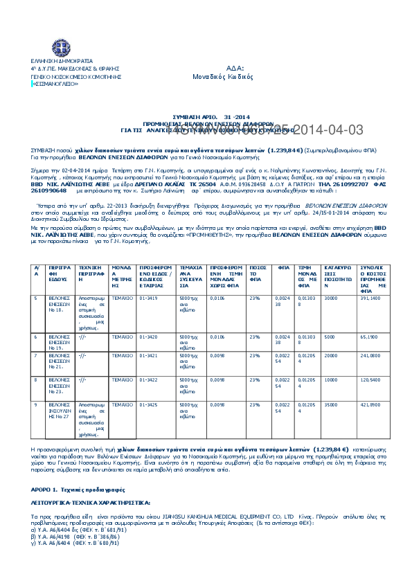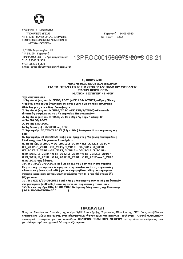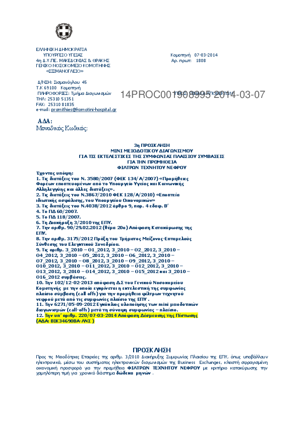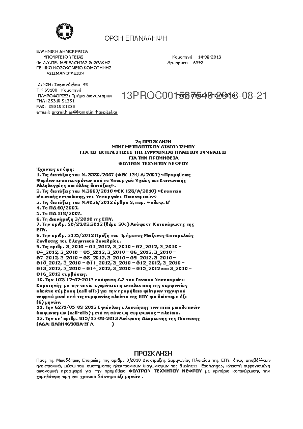 5. 2H ΠΡΟΣΚΛΗΣΗ ΜΙΝΙ ΜΕΙΟΔΟΤΙΚΟΥ ΔΙΑΓΩΝΙΣΜΟΥ ΓΙΑ ΤΙΣ ΕΚΤΕΛΕΣΤΙΚΕΣ ΤΗΣ ΣΥΜΦΩΝΙΑΣ ΠΛΑΙΣΙΟΥ ΣΥΜΒΑΣΕΙΣ ΓΙΑ ΤΗΝ ΠΡΟΜΗΘΕΙΑ ΦΙΛΤΡΩΝ ΤΕΧΝΗΤΟΥ ΝΕΦΡΟΥ