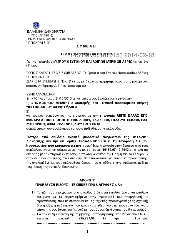 5. ΣΥΜΒΑΣΗ ΠΡΟΜΗΘΕΙΑΣ ΥΓΡΟΥ ΟΞΥΓΟΝΟΥ ΚΑΙ ΛΟΙΠΩΝ ΙΑΤΡΙΚΩΝ ΑΕΡΙΩΝ ΛΙΝΤΕ ΕΛΛΑΣ