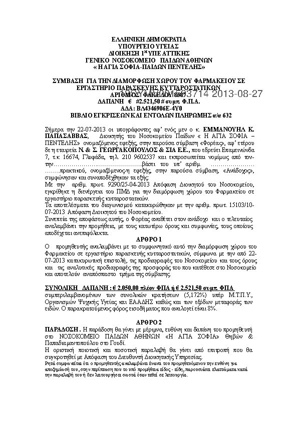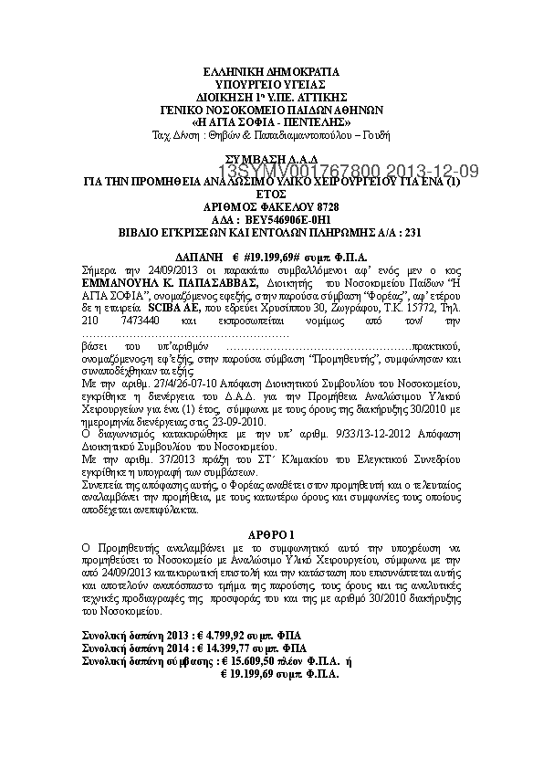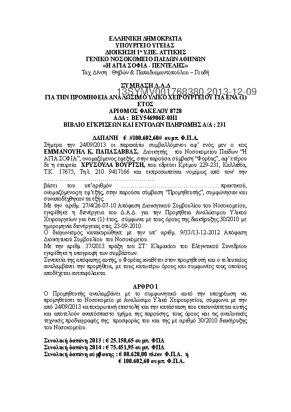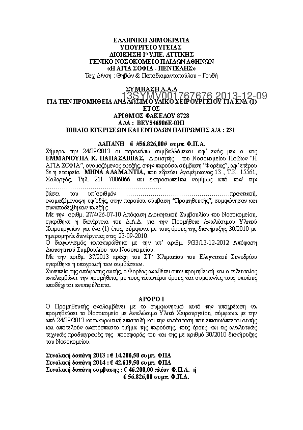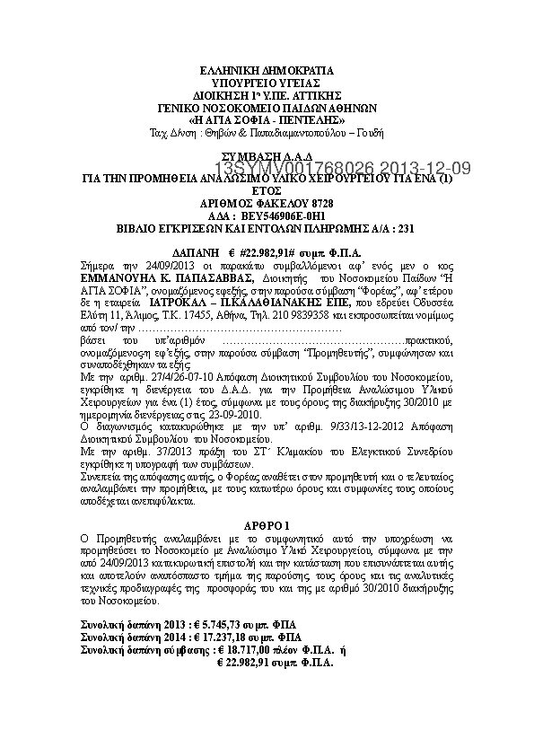 1. Συμπληρωματική Σύμβαση ΔΑΔ για την Προμήθεια Αναλώσιμου Υλικού Χειρουργείων