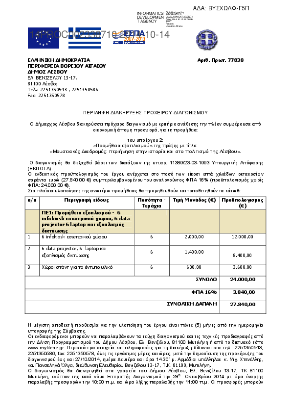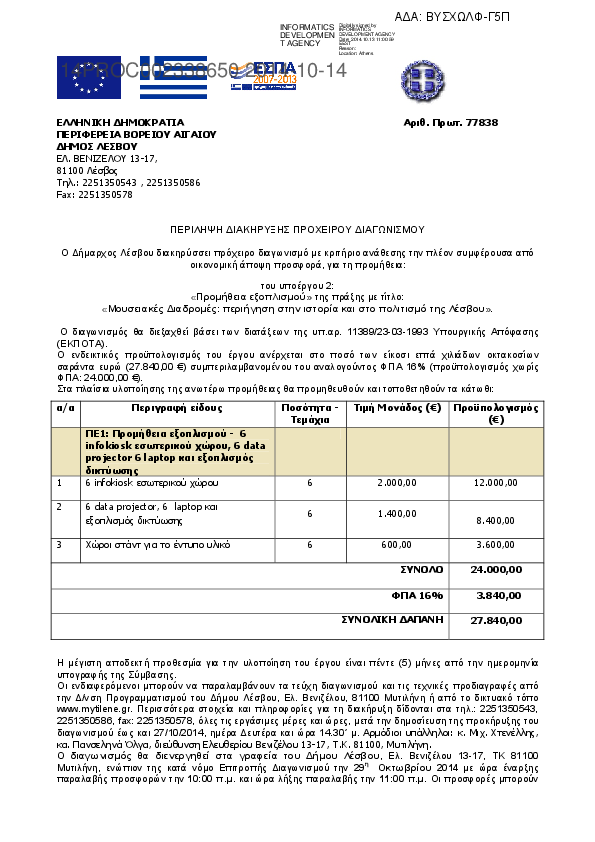 6. Προμήθεια εξοπλισμού "Μουσειακές διαδρομές: περιήγηση στην ιστορία και στον πολιτισμό της Λέσβου"
