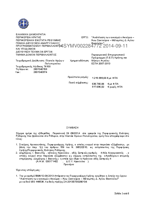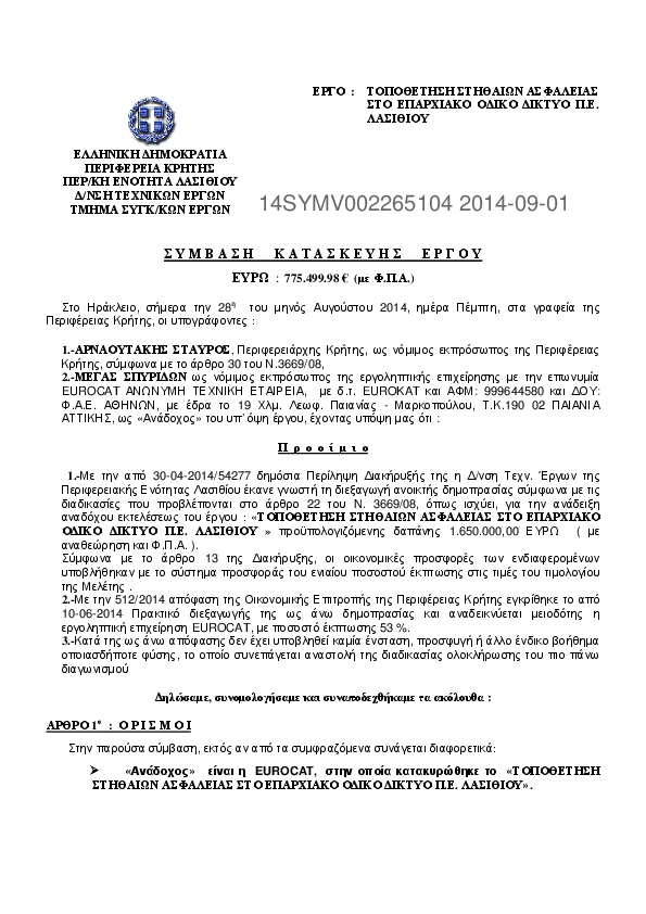 1. ΣΥΜΒΑΣΗ ΤΟΥ ΕΡΓΟΥ ΤΟΠΟΘΕΤΗΣΗ ΣΤΗΘΑΙΝ ΑΣΦΑΛΕΙΑΣ ΣΤΟ ΕΠΑΡΧΙΑΚΟ ΟΙΚΟ ΙΚΤΥΟ Π.Ε. ΛΑΣΙΘΙΟΥ
