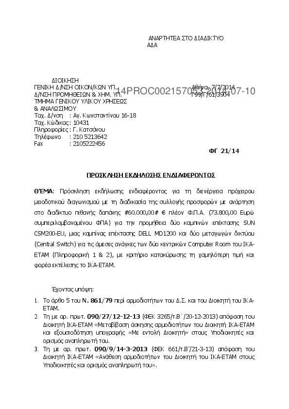 1. Προκήρυξη Διεθνή Ανοικτού διαγωνισμού, με σφραγισμένες προσφορές, με κριτήριο κατακύρωσης την πλέον συμφέρουσα από οικονομική άποψη προσφορά σε ΕΥΡΩ, για την υλοποίηση του έργου «Έκδοση Σύνταξης σε μία Ημέρα», της πράξης με κωδικό MIS 37...