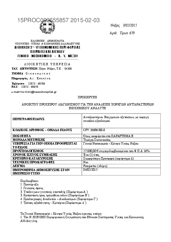 2. ΠΡΟΧΕΙΡΟΣ ΔΙΑΓΩΝΙΣΜΟΣ ΑΝΤΙΔΡΑΣΤΗΡΙΩΝ ΑΙΜΑΤΟΛΟΓΙΚΟΥ ΑΝΑΛΥΤΗ ΓΙΑ ΤΙΣ ΑΝΑΓΚΕΣ ΤΟΥ Γ.Ν-Κ.Υ ΝΑΞΟΥ