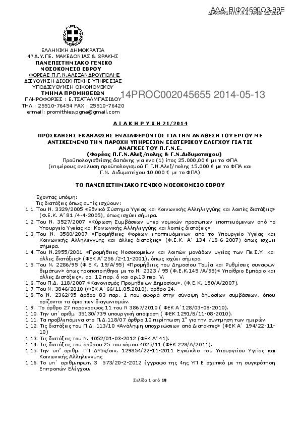 2. ΠΡΟΣΚΛΗΣΗΣ ΕΚΔΗΛΩΣΗΣ ΕΝΔΙΑΦΕΡΟΝΤΟΣ ΓΙΑ ΤΗΝ ΑΝΑΘΕΣΗ ΤΟΥ ΕΡΓΟΥ ΜΕΑΝΤΙΚΕΙΜΕΝΟ ΤΗΝ ΠΑΡΟΧΗ ΥΠΗΡΕΣΙΩΝ EΣΩΤΕΡΙΚΟΥ ΕΛΕΓΧΟΥ ΓΙΑ ΤΙΣΑΝΑΓΚΕΣ ΤΟΥ Π.Γ.Ν.Ε.(Φορέας Π.Γ.Ν.Αλεξ/πολης & Γ.Ν.Διδυμοτείχου)