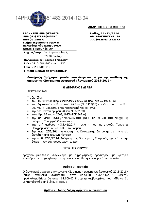 10. ΔΙΚΑΚΗΡΥΞΗ ΠΡΟΧΕΙΡΟΥ ΔΙΑΓΩΝΙΣΜΟΥ ΓΙΑ ΤΗΝ ΕΡΓΑΣΙΑ ΣΥΝΤΗΡΗΣΗ ΕΦΑΡΜΟΓΩΝ ΛΟΓΙΣΜΙΚΟΥ 2015-2016