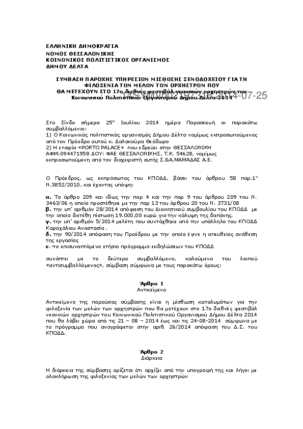 6. ΣΥΜΒΑΣΗ ΠΑΡΟΧΗΣ ΥΠΗΡΕΣΙΩΝ ΜΙΣΘΩΣΗΣ ΞΕΝΟΔΟΧΕΙΟΥ ΓΙΑ ΤΗ ΦΙΛΟΞΕΝΙΑ ΤΩΝ ΜΕΛΩΝ ΤΩΝ ΟΡΧΗΣΤΡΩΝ ΠΟΥ ΘΑ ΜΕΤΕΧ