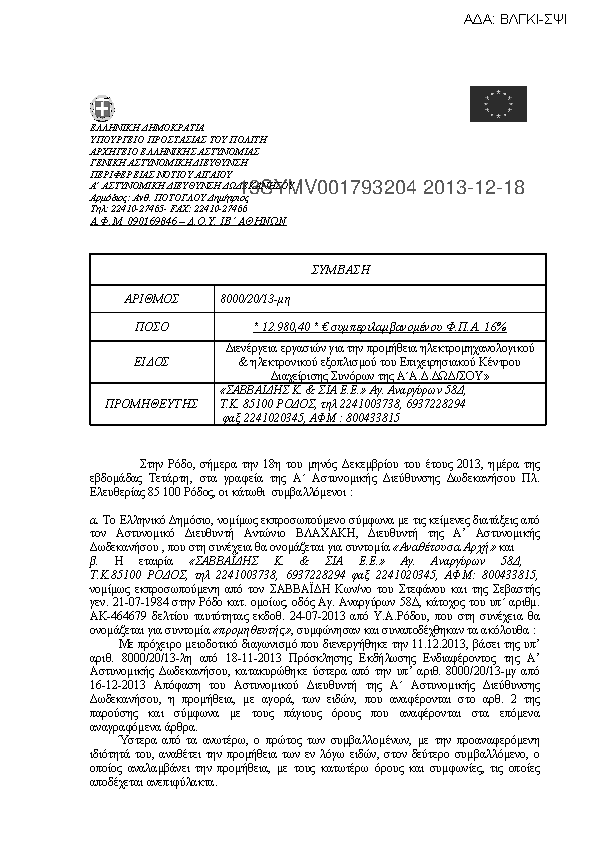 10. ΣΥΜΒΑΣΗ ΠΡΟΜΗΘΕΙΑΣ ΗΛΕΚΤΡΟΜΗΧ/ΚΟΥ & ΗΛΕΚΤΡΟΝΙΚΟΥ ΕΞΟΠΛΙΣΜΟΥ ΤΟΥ ΕΠΙΧ/ΚΟΥ ΚΕΝΤΡΟΥ ΔΙΑΧ/ΣΗΣ Α΄Α.Δ.ΔΩΔ.