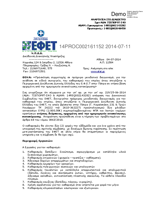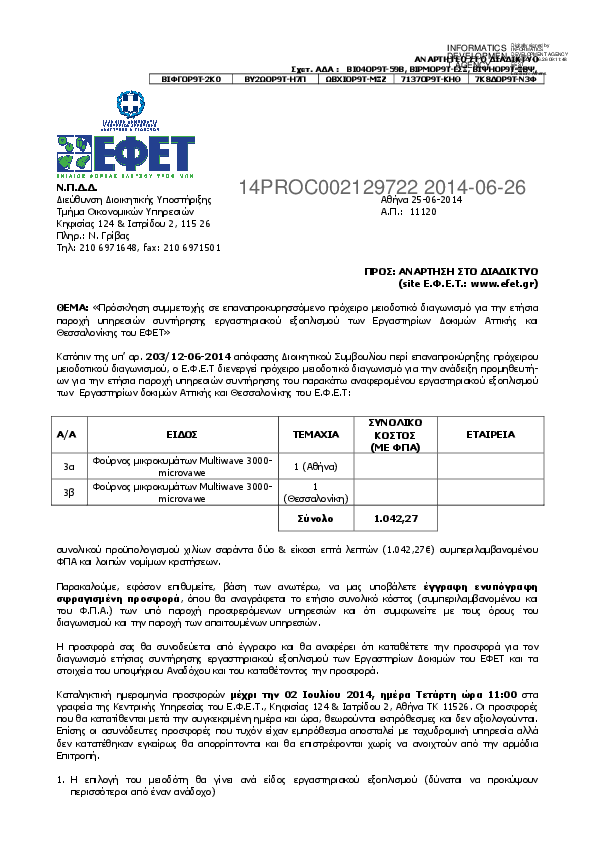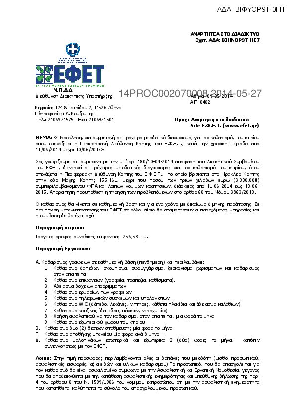 1. Πρόσκληση, για συμμετοχή σε πρόχειρο μειοδοτικό διαγωνισμό, για τον καθαρισμό, του κτιρίουόπου στεγάζεται η Περιφερειακή ιεύθυνση Κρήτης του Ε.Φ.Ε.Τ., κατά την χρονική περίοδο από11/06/2014 μέχρι 10/06/2015