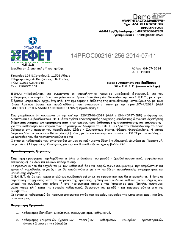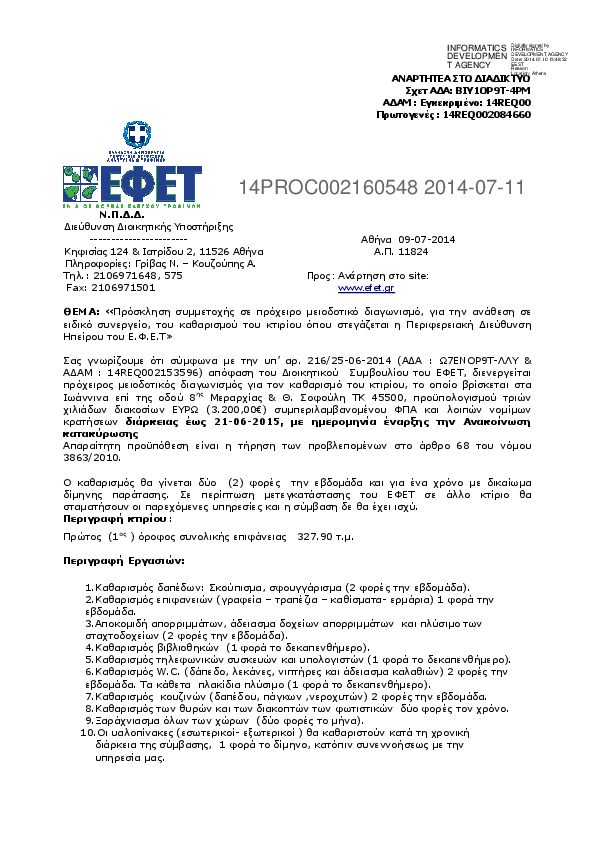 10. Πρόσκληση για την ανάθεση του καθαρισμού των Κεντρ. Υπηρεσίας- ΠΔ Αττικής & Εργαστηρίων ΕΦΕΤ