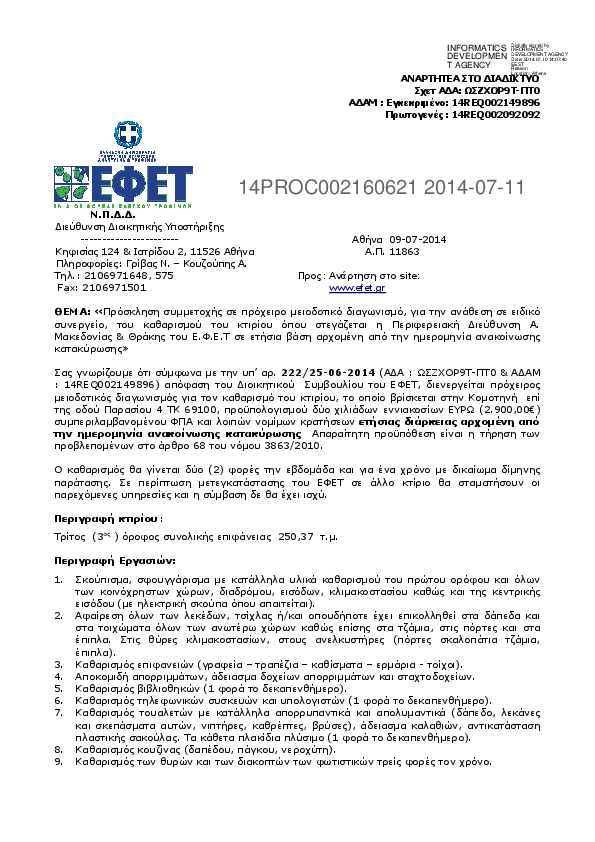 9. Πρόσκληση για την ανάθεση σε ειδικό συνεργείο, του καθαρισμού του κτιρίου όπου στεγάζεται η ΠΔΘ ΕΦΕΤ