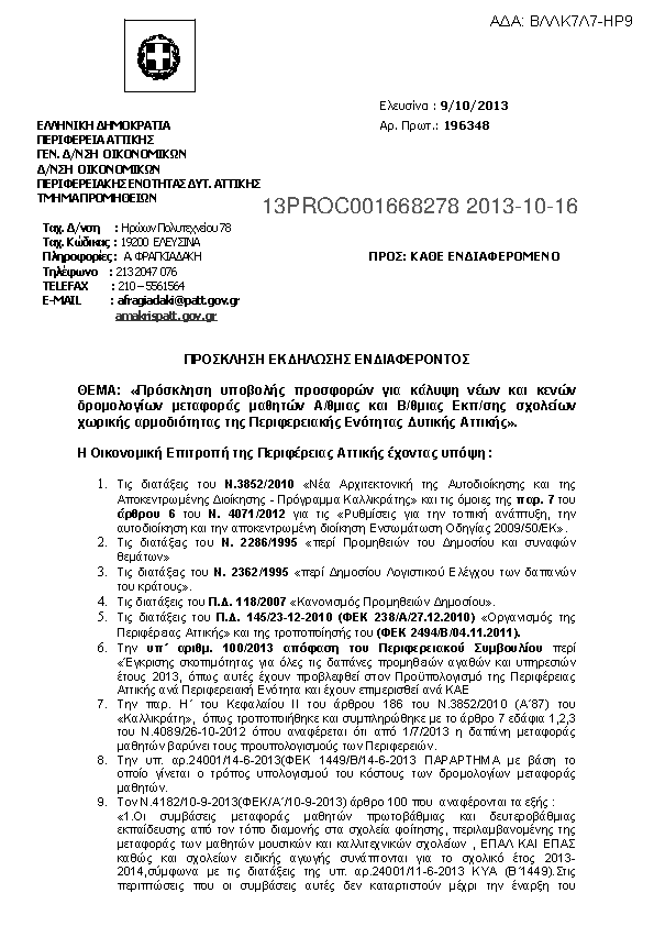 1. Πρόσκληση υποβολής προσφορών για κάλυψη νέων και κενών δρομολογίων μεταφοράς μαθητών Α/θμιας και Β/θμιας Εκπ/σης σχολείων χωρικής αρμοδιότητας της Περιφερειακής Ενότητας Δυτικής Αττικής