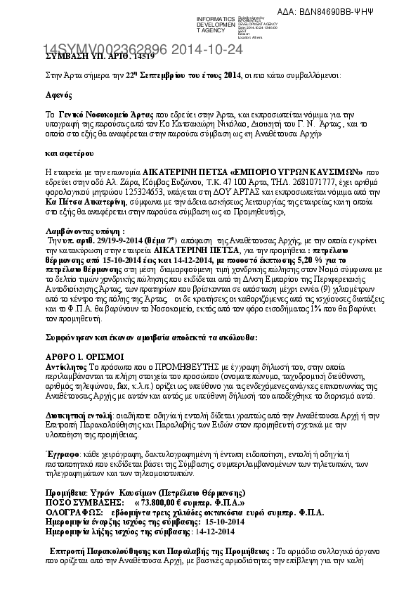 10. ΣΥΜΒΑΣΗ ΓΙΑ ΠΡΟΜΗΘΕΙΑ ΥΓΡΩΝ ΚΑΥΣΙΜΩΝ Γ.Ν. ΑΡΤΑΣ