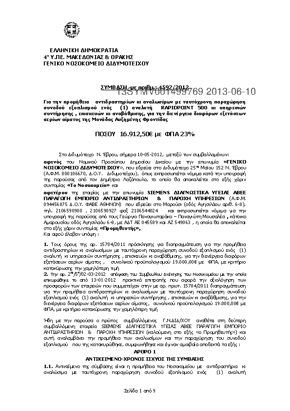 2. ΣΥΜΒΑΣΗ ΠΡΟΜΗΘΕΙΑΣ ΑΝΤΙΔΡΑΣΤΗΡΙΩΝ ΚΙ ΑΝΑΛΩΣΙΜΩΝ ΓΙΑ ΤΗ ΔΙΕΝΕΡΓΕΙΑ ΔΙΑΦΟΡΩΝ ΕΞΕΤΑΣΕΩΝ ΑΕΡΙΩΝ ΑΙΜΑΤΟΣ