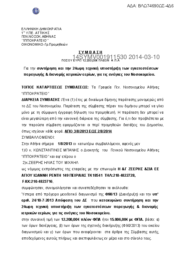 6. ΣΥΜΒΑΣΗ ΓΙΑ ΤΗ ΣΥΝΤΗΡΗΣΗ ΤΩΝ ΕΓΚΑΤΑΣΤΑΣΕΩΝ ΠΑΡΑΓΩΓΗΣ & ΔΙΑΝΟΜΗΣ ΙΑΤΡΙΚΩΝ ΑΕΡΙΩΝ, Η & Γ ΖΕΕΡΗΣ &ΣΙΑ