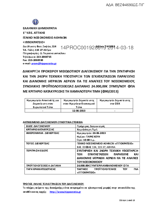 5. ΔΙΑΚΗΡΥΞΗ ΠΡΟΧΕΙΡΟΥ ΜΕΙΟΔΟΤΙΚΟΥ ΔΙΑΓΩΝΙΣΜΟΥ ΓΙΑ ΤΗΝ ΣΥΝΤΗΡΗΣΗ ΚΑΙ ΤΗΝ 24ΩΡΗ ΤΕΧΝΙΚΗ ΥΠΟΣΤΗΡΙΞΗ ΤΩΝ ΕΓΚΑΤΑΣΤΑΣΕΩΝ ΠΑΡΑΓΩΓΗΣ ΚΑΙ ΔΙΑΝΟΜΗΣ ΙΑΤΡΙΚΩΝ ΑΕΡΙΩΝ ΓΙΑΤΙΣ ΑΝΑΓΚΕΣ ΤΟΥ ΝΟΣΟΚΟΜΕΙΟΥ, ΣΥΝΟΛΙΚΗΣ ΠΡΟΥΠΟΛΟΓΙΣΘΕΙΣΑΣ ΔΑΠΑΝΗΣ 24.000,00 ΕΥΡΩ ΣΥ...