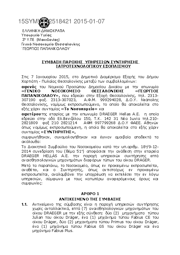 1. ΣΥΜΒΑΣΗ ΣΥΝΤΗΡΗΣΗΣ ΑΝΑΙΣΘΗΣΙΟΛΟΓΙΚΩΝ ΜΗΧΑΝΗΜΑΤΩΝ DRAGER