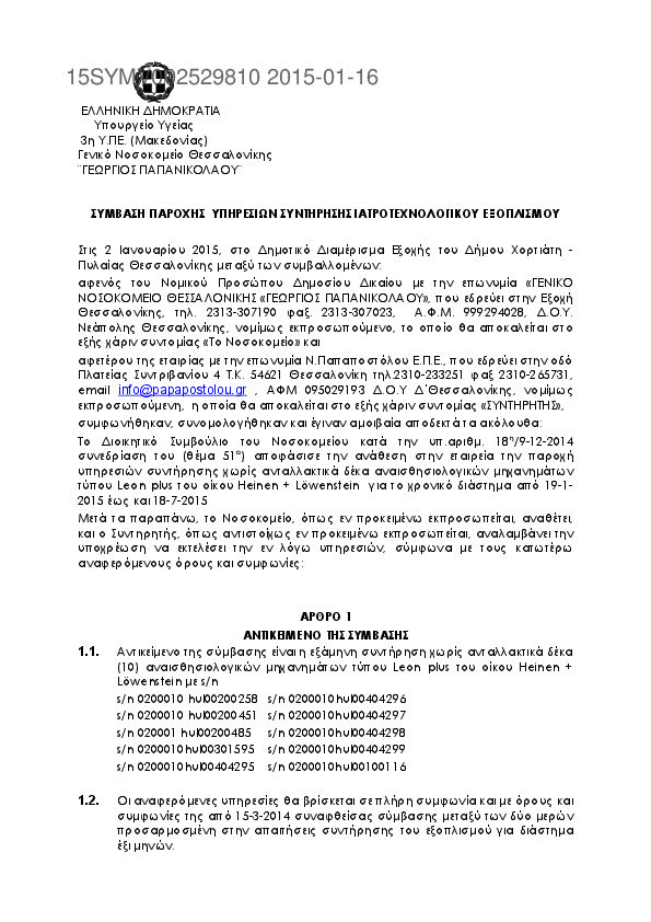 7. ΣΥΜΒΑΣΗ ΣΥΝΤΗΡΗΣΗΣ ΑΝΑΙΣΘΗΣΙΟΛΟΓΙΚΩΝ ΜΗΧΑΝΗΜΑΤΩΝ ΤΥΠΟΥ LEON PLUS ΑΠΟ ΤΗΝ ΕΤΑΙΡΕΙΑ Ν.ΠΑΠΑΠΟΣΤΟΛΟΥ ΕΠΕ