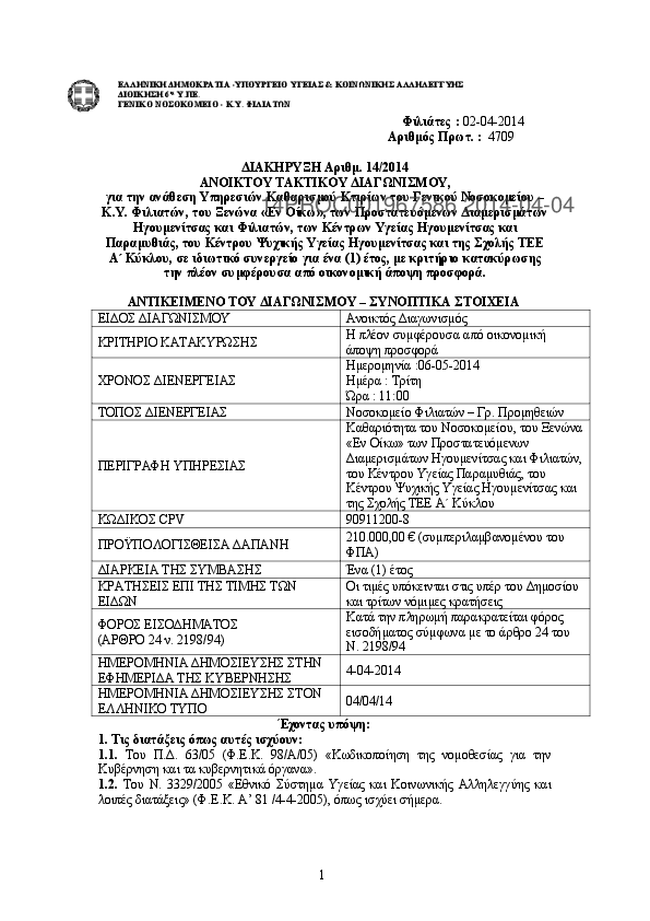 4. ΔΙΑΚΗΡΥΞΗ ΤΑΚΤΙΚΟΥ ΔΙΑΓΩΝΙΣΜΟΥ ΚΑΘΑΡΙΣΜΟΥ ΚΤΙΡΙΩΝ ΤΟΥ Γ.Ν.-Κ.Υ.ΦΙΛΙΑΤΩΝ