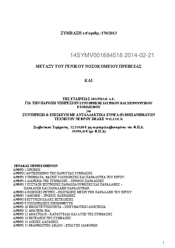 1. ΓΙΑ ΤΗΝ ΠΑΡΟΧΗ ΥΠΗΡΕΣΙΩΝ ΣΥΝΤΗΡΗΣΗΣ ΙΑΤΡΙΚΟΥ ΚΑΙ ΧΕΙΡΟΥΡΓΙΚΟΥ ΕΞΟΠΛΙΣΜΟΥ