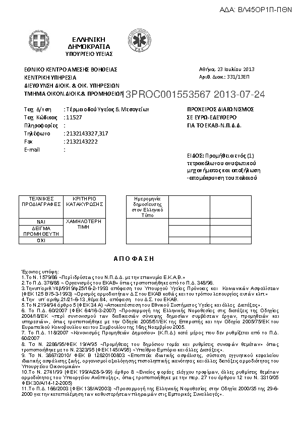 4. Δημόσιος ανοικτός διαγωνισμός για την προμήθεια 167 ΑΣΘΕΝΟΦΟΡΩΝ ΑΥΤΟΚΙΝΗΤΩΝ KAI 19 KINHTΩΝ ΜΟΝΑΔΩΝ ΓΙΑ ΤΙΣ ΑΝΑΓΚΕΣ ΤΟΥ ΕΚΑΒ ΣΤΑ ΠΛΑΙΣΙΑ ΤΩΝ ΠΕΡΙΦΕΡΕΙΑΚΩΝΕΠΙΧΕΙΡΗΣΙΑΚΩΝ ΠΡΟΓΡΑΜΜΑΤΩΝ ΕΣΠΑ 2007