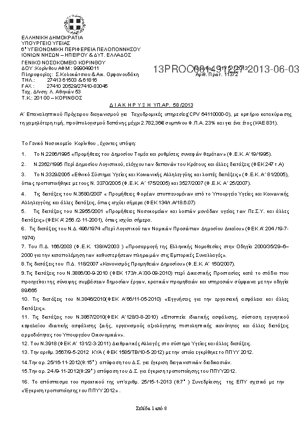 4. ΔΙΑΚΗΡΥΞΗ ΥΠ΄ΑΡΙΘΜ.32/2013 ΠΡΟΧΕΙΡΟΥ ΔΙΑΓΩΝΙΣΜΟΥ ΓΙΑ ΥΠΗΡΕΣΙΕΣ ΠΑΡΟΧΗΣ ΓΕΥΜΑΤΩΝ CPV 55320000