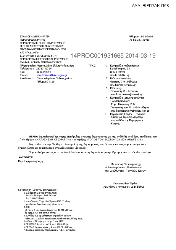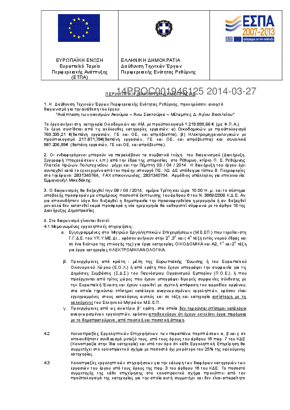 9. Η Διεύθυνση Τεχνικών Έργων Περιφερειακής Ενότητας Ρεθύμνης, προκηρύσσει ανοιχτό διαγωνισμό για τηνανάθεση του έργου«ΤΟΠΟΣ ΤΟΥ ΒΟΣΚΟΥ ΔΗΜΟΥ ΑΝΩΓΕΙΩΝ» 1o Υποέργο : Κατασκευή κτισμάτων