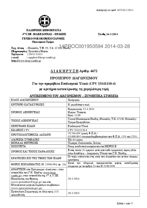1. ΔΙΑΚΗΡΥΞΗ ΑΡΙΘ. 4672/2014 ΓΙΑ ΤΗΝ ΠΡΟΜΗΘΕΙΑ ΕΠΙΔΕΣΜΙΚΟΥ ΥΛΙΚΟΥ (CPV 33141110-4) ΜΕ ΚΡΙΤΗΡΙΟ ΚΑΤΑΚΥΡΩΣΗΣ ΤΗ ΧΑΜΗΛΟΤΕΡΗ ΤΙΜΗ