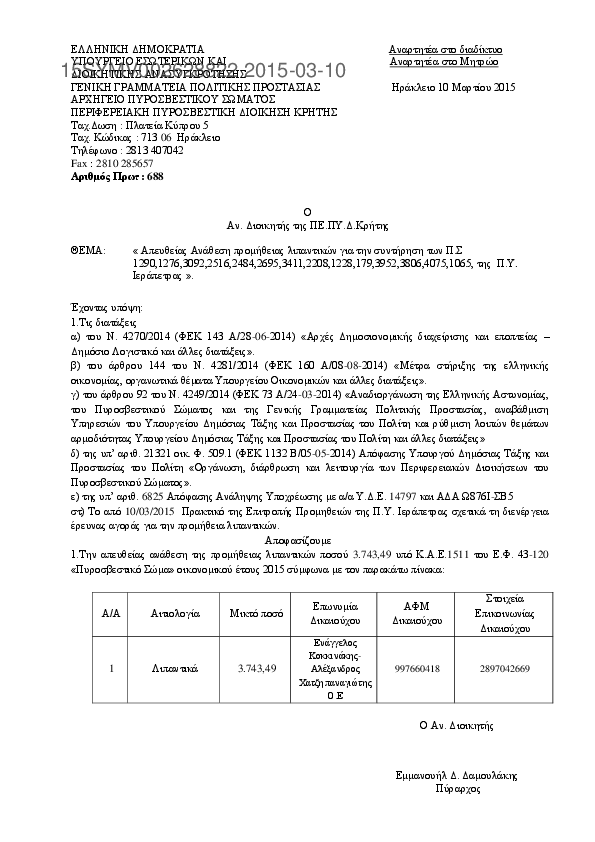 10. ΑΠΕΥΘΕΙΑΣ ΑΝΑΘΕΣΗ ΠΡΟΜΗΘΕΙΑΣ ΛΙΠΑΝΤΙΚΩΝ ΓΙΑ ΤΗΝ ΣΥΝΤΗΡΗΣΗ ΤΩΝ ΟΧΗΜΑΤΩΝ ΤΗΣ ΠΥ ΙΕΡΑΠΕΤΡΑΣ