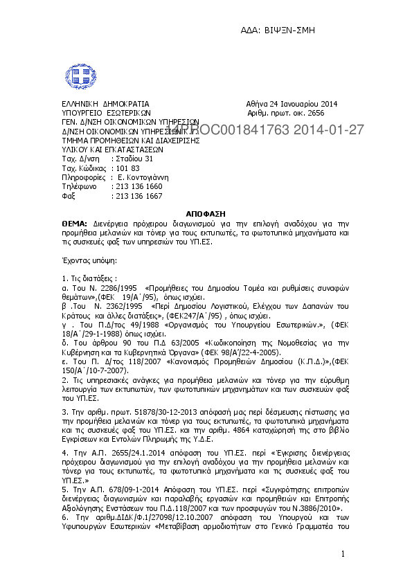 7. Διενέργεια πρόχειρου διαγωνισμού για την επιλογή αναδόχου για την προμήθεια μελανιών και τόνερ για τους εκτυπωτές, τα φωτοτυπικά μηχανήματα και τις συσκευές φαξ των υπηρεσιών του ΥΠ.ΕΣ.