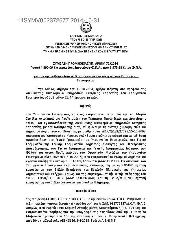 3. ΣΥΜΒΑΣΗ ΠΡΟΜΗΘΕΙΑΣ ΥΠ. ΑΡΙΘΜ 72/2014 Ποσού 4.890,09 € συμπεριλαμβανομένου Φ.Π.Α., ήτοι 3.975,68 € π