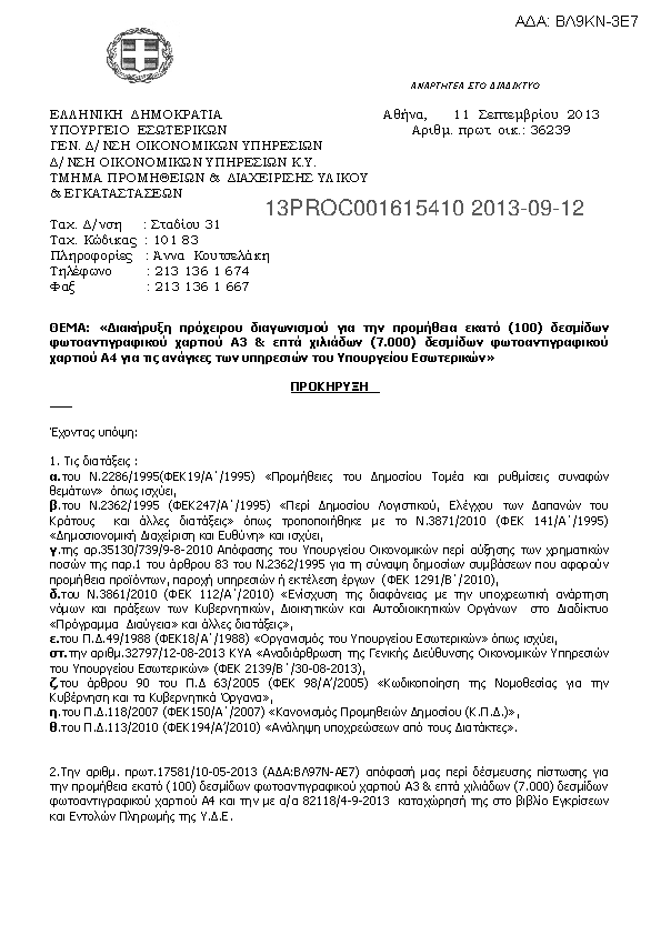 3. Διακήρυξη πρόχειρου διαγωνισμού για την προμήθεια εκατό (100) δεσμίδων φωτοαντιγραφικού χαρτιού Α3 &