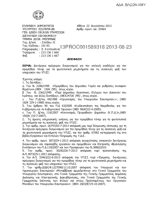 4. Διενέργεια πρόχειρου διαγωνισμού για την επιλογή αναδόχου για την προμήθεια τόνερ για τα φωτοτυπικά μηχανήματα και τις συσκευές φαξ των υπηρεσιών του ΥΠ.ΕΣ.