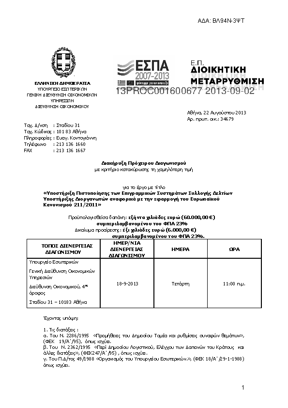 1. Διακήρυξη Πρόχειρου Διαγωνισμού με κριτήριο κατακύρωσης τη χαμηλότερη τιμή για το έργο με τίτλο «Υποστήριξη Πιστοποίησης των Επιγραμμικών Συστημάτων Συλλογής Δελτίων Υποστήριξης Διοργανωτών αναφορικά με την εφαρμογή του Ευρωπαϊκού Κανονι...