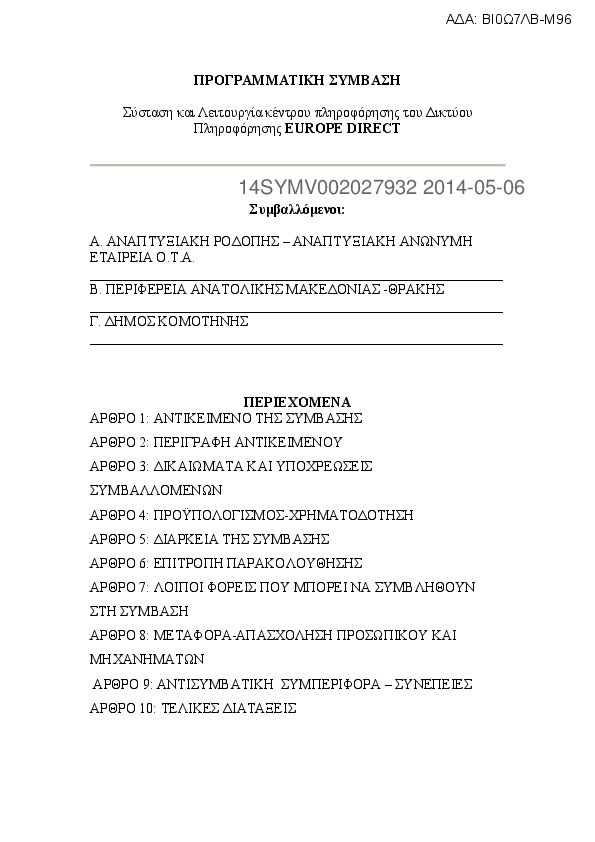 8. ΠΡΟΓΡΑΜΜΑΤΙΚΗ ΣΥΜΒΑΣ: Σύσταση και Λειτουργία κέντρου πληροφόρησης του Δικτύου Πληροφόρησης EUROPE DI
