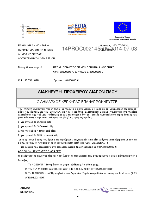 1. ΠΡΟΧΕΙΡΟΣ ΔΙΑΓΩΝΙΣΜΟΣ " ΠΡΟΜΗΘΕΙΑ ΕΞΟΠΛΙΣΜΟΥ ΞΕΝΩΝΑ ΦΙΛΟΞΕΝΙΑΣ " ΣΤΑ ΠΛΑΙΣΙΑ ΥΛΟΠΟΙΗΣΗΣ ΤΗΣ ΠΡΑΞΗΣ:''ΑΝΑΠΤΥΞΗ ΔΟΜΩΝ ΚΑΙ ΥΠΗΡΕΣΙΩΝ ΤΗΣ ΤΟΠΙΚΗΣ ΑΥΤΟΔΙΟΙΚΗΣΗΣ ΠΡΟΣ ΟΦΕΛΟΣ ΤΩΝ ΓΥΝΑΙΚΩΝ ΚΑΙ ΓΙΑ ΤΗΝ ΚΑΤΑΠΟΛΕΜΗΣΗ ΤΗΣ ΒΙΑΣ"