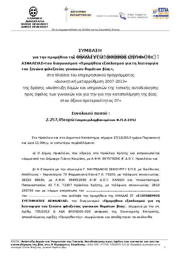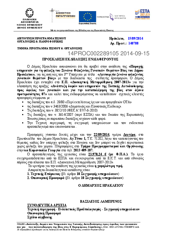 9. Παροχής υπηρεσιών για τη φύλαξη του Ξενώνα Φιλοξενίας Γυναικών Θυμάτων Βίας του Δήμου Ηρακλείου»