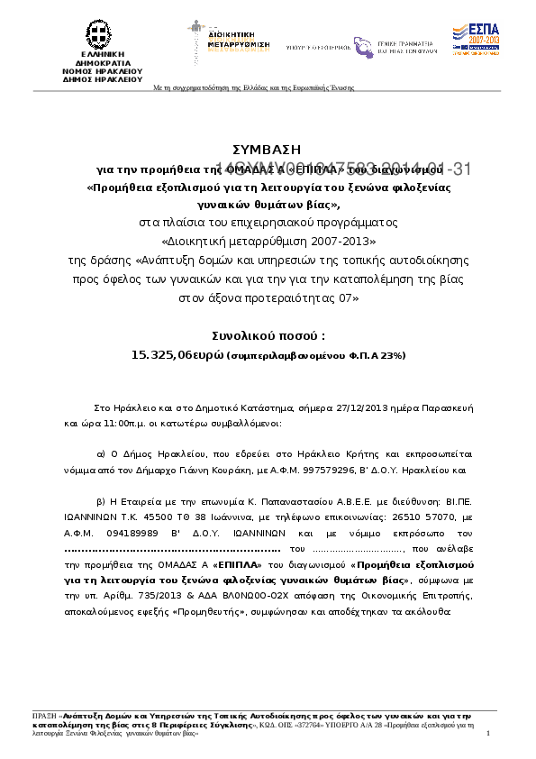 2. ΣΥΜΒ ΟΜΑΔ Α "ΠΡΟΜΗΘΕΙΑ ΕΞΟΠΛΙΣΜΟΥ ΓΙΑ ΤΗ ΛΕΙΤ. ΤΟΥ ΞΕΝΩΝΑ ΦΙΛΟΞΕΝΙΑΣ ΓΥΝΑΙΚΩΝ ΘΥΜΑΤΩΝ ΒΙΑΣ