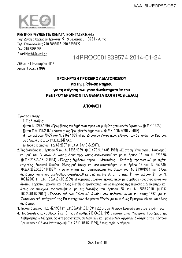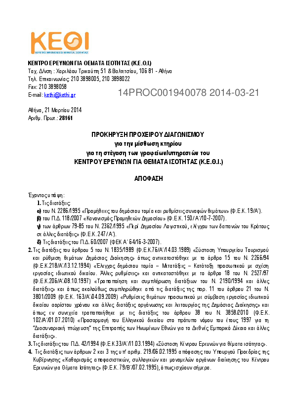 4. Προκήρυξη Πρόχειρου Διαγωνισμού για την μίσθωση κτηρίου για τη στέγαση των γραφείων / υπηρεσιών του Κ.Ε.Θ.Ι.