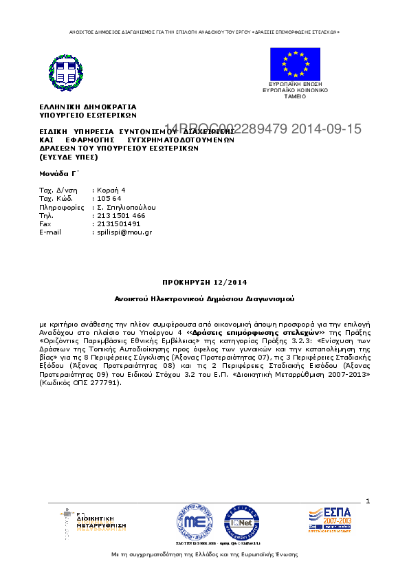 1. Προκήρυξη Ανοιχτού Διαγωνισμού για το έργο "Σύμβουλος εκ των προτέρων αξιολόγησης και στρατηγικής περιβαλλοντικής εκτίμησης του ΠΕΠ Περιφέρειας Ηπείρου 2014
