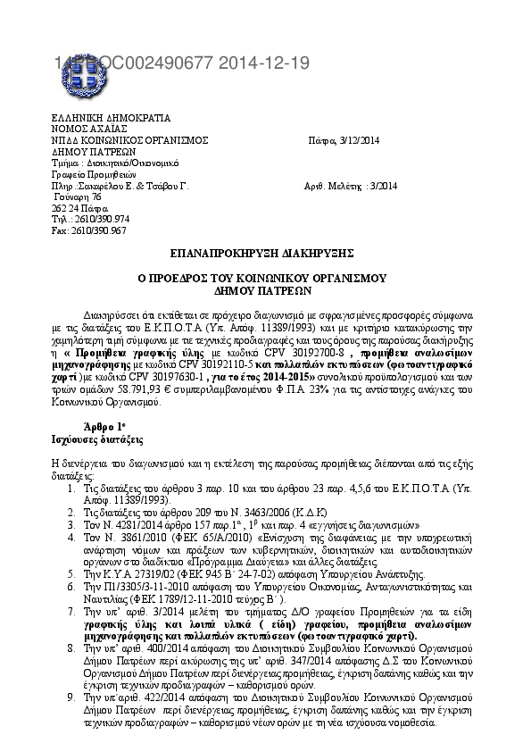 2. ΔΙΑΚΗΡΥΞΗ ΠΡΟΜΗΘΕΙΑΣ ΓΡΑΦΙΚΗΣ ΥΛΗΣ, ΑΝΑΛΩΣΙΜΩΝ ΜΗΧΑΝΟΓΡΑΦΗΣΗΣ, ΦΩΤΟΑΝΤΙΓΡΑΦΙΚΟ ΧΑΡΤΙ