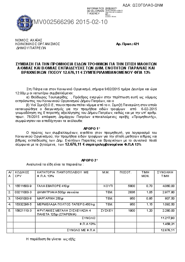 6. ΣΥΜΒΑΣΗ ΠΡΟΜΗΘΕΙΑΣ ΕΙΔΩΝ ΤΡΟΦΙΜΩΝ ΓΙΑ ΣΙΤΙΣΗ ΜΑΘΗΤΩΝ ΔΕ ΒΡΑΧΝΕΙΚΩΝ ΠΑΡΑΛΙΑΣ