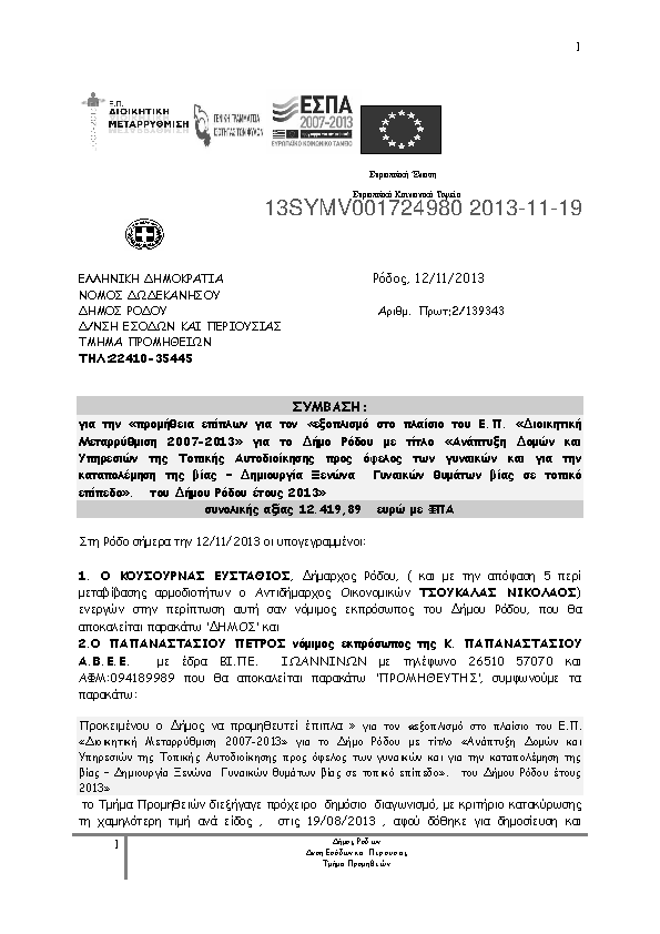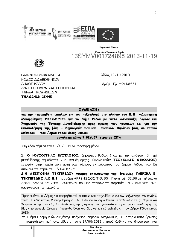 1. ΠΡ. εξοπλισμού στο πλαίσιο του Ε.Π. « για ξενώνα κακοποιημενων γυν. (κλιν., ειδη εστίασ, επιπλ,παιχ