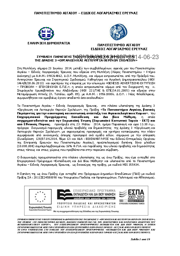 7. ΣΥΜΒΑΣΗ ΠΑΡΑΓΩΓΗΣ ΥΛΙΚΟΥ ΠΡΟΒΟΛΗΣ ΚΑΙ ΔΗΜΟΣΙΟΤΗΤΑΣ ΤΗΣ ΔΡΑΣΗΣ 3 «ΟΡΓΑΝΩΣΗ ΚΑΙ ΛΕΙΤΟΥΡΓΙΑ ΘΕΡΙΝΩΝ ΣΧ